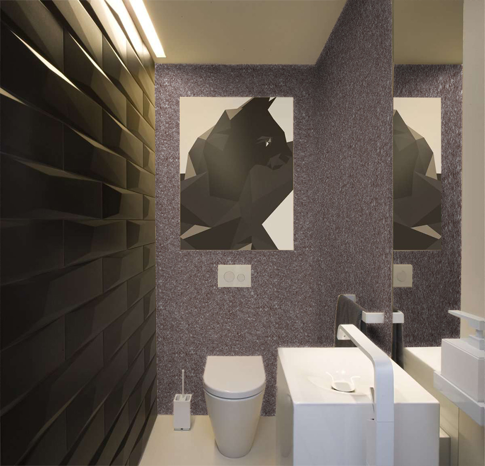 - Отделка выступающих частей. В туалетах часто присутствуют разные коробы, предназначенные для визуального прикрытия труб, тумб и прочих аналогичных элементов интерьера. Отделать все поверхности другими материалами в таком случае весьма проблематично. А вот жидкие обои отлично справляются с этой задачей.