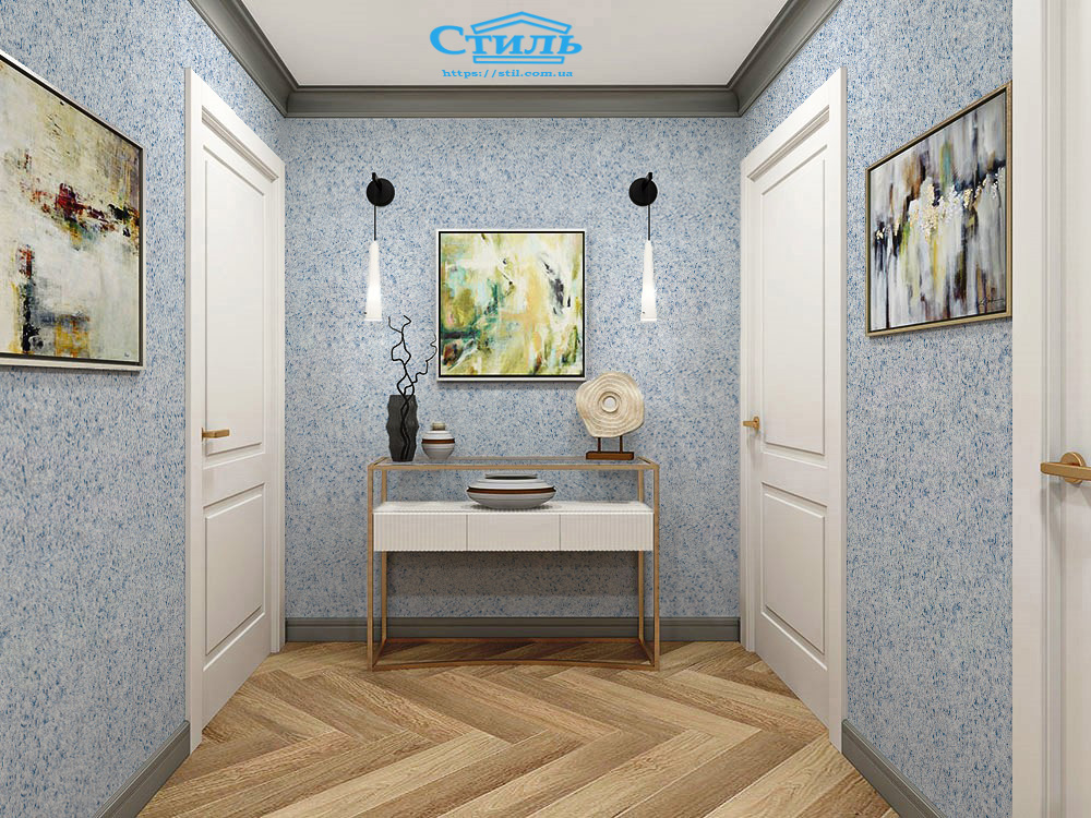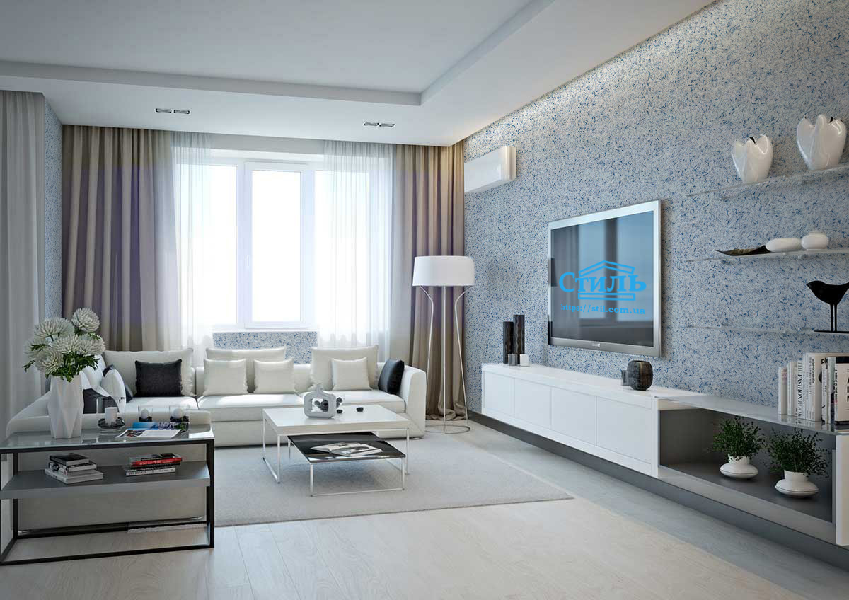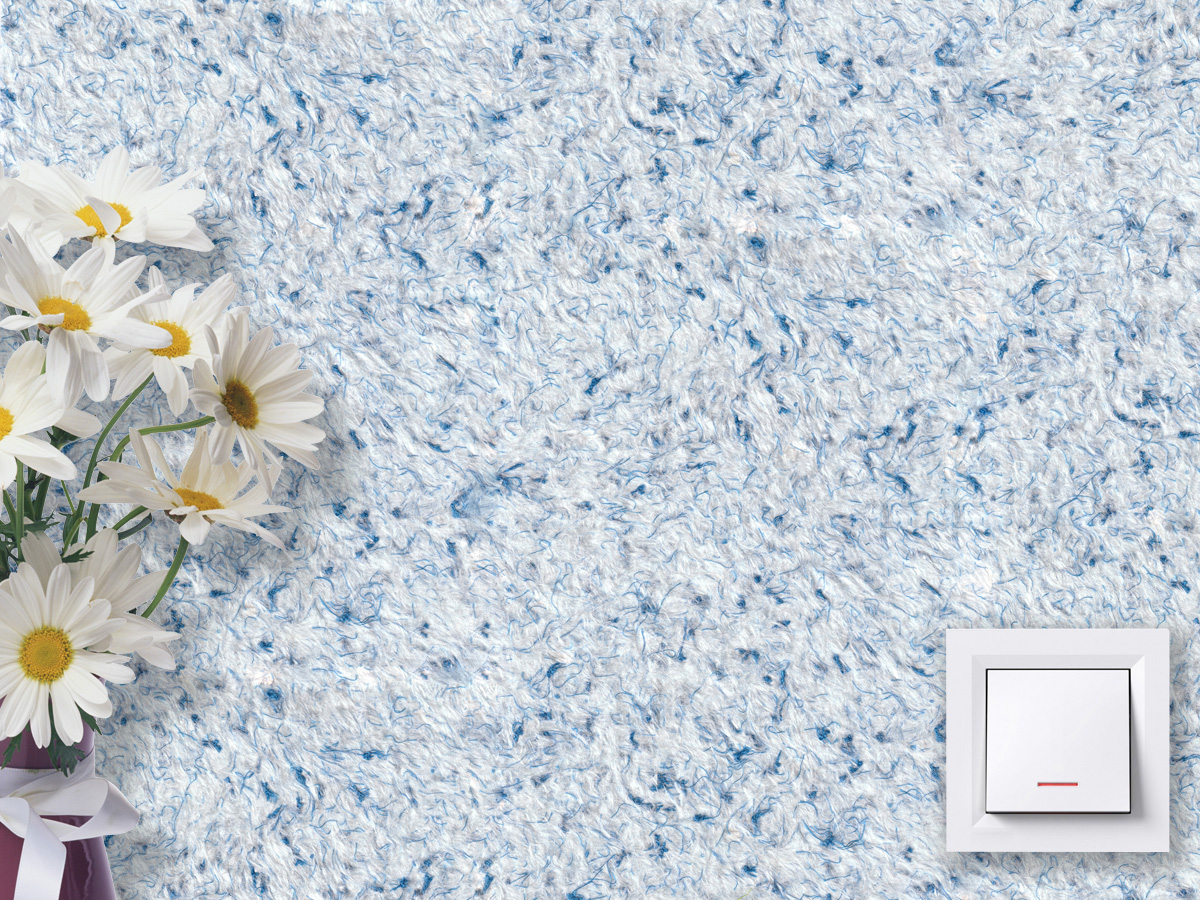 Синяя текстильная нить создает привлекательный узор на стене и эффектно тонирует белое основание. Жидкие обои тип 10 – оптимальный вариант для комнат небольших размеров, поскольку синие тона зрительно увеличивают помещение. Синий цвет снимает агрессию, восстанавливает душевный покой, дарит чувство умиротворения и безмятежности.