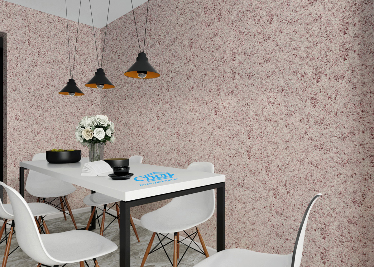 Главной «изюминкой» жидких обоев тип 124 ТМ «Стиль» является эффектная комбинация светлой основы и текстильных нитей бордового цвета. Нить создает уникальный контрастный рисунок на стене, придавая ей очень интересный и презентабельный вид.