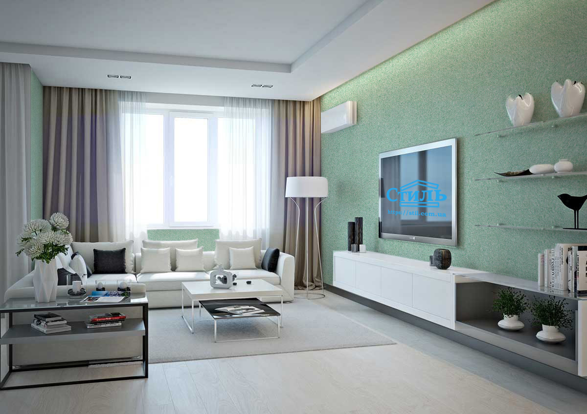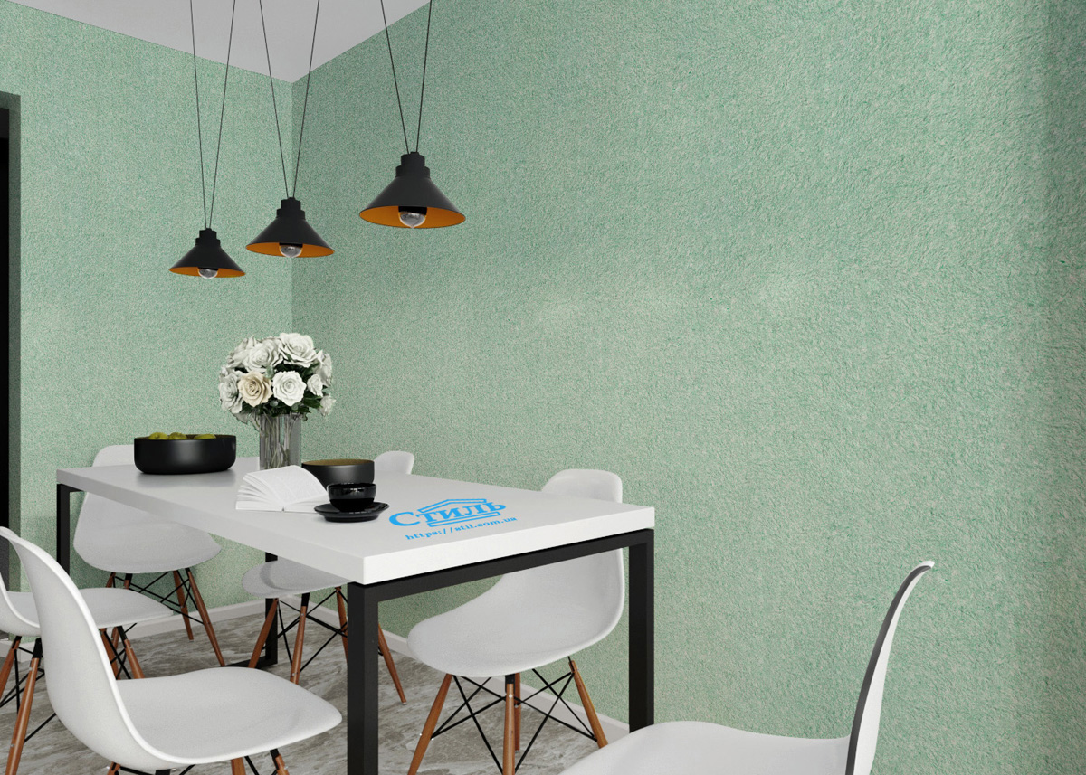 Зеленый цвет ассоциируется со свежестью и обновлением, а жидкие обои тип 127 ТМ «Стиль» - с умиротворением и спокойствием. Такой эффект им придают шелковые нити, тонирующие материал в цвет только что распустившейся весенней листвы. Плюс ко всему нити формируют на стене очень красивый и всегда уникальный узор.