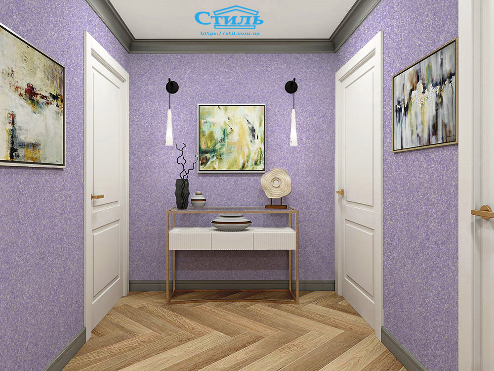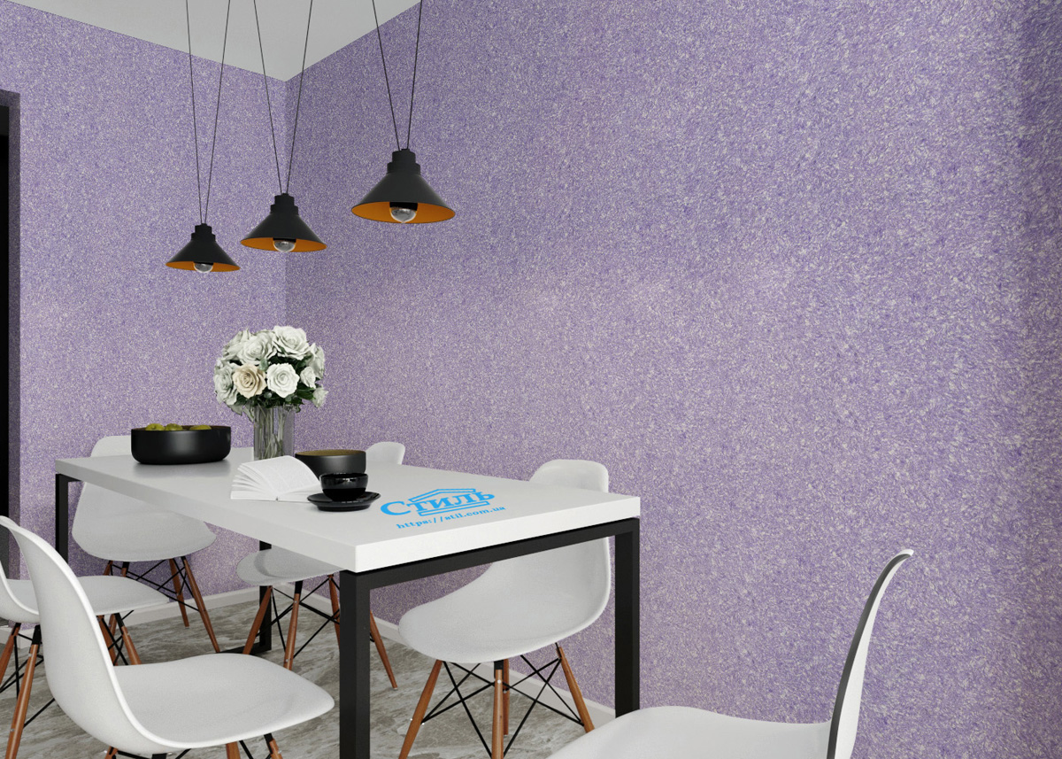 Более светлая основа покрытия красиво тонируется искусственным шелком насыщенного сиреневого цвета. Тип 155 жидких обоев можно использовать для покрытия всех стен. В этом случае желательно, чтобы комната была сравнительно просторной и с высокими потолками. В более маленьких помещениях дизайнеры рекомендуют комбинировать сиреневые обои со светло-салатовыми, светло-желтыми, светло-розовыми, серыми или голубыми.