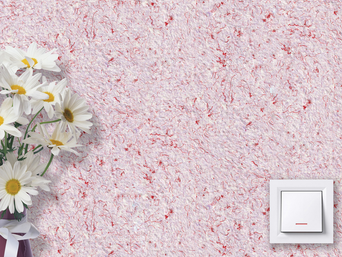 Основной наполнитель дополняется шелковыми волокнами и текстильными нитями, которые красиво тонируют тип 160 жидких обоев в нежные красные и сиреневые тона. Такое покрытие гармонично впишется в интерьер гостиной, спальни и даже кухни.
