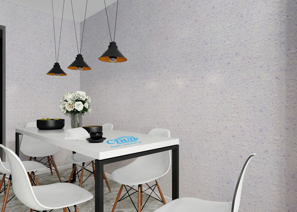 Красивые сиреневые разводы и переливы на покрытии обеспечиваются добавлением в состав текстильных нитей. Материал можно использовать самостоятельно или в комбинации с аналогичными покрытиями светло-салатового, светло-желтого, светло- розового, серого, голубого цвета. Даже экстравагантные металлические оттенки будут выглядеть вполне уместно в окружении мягкой и нежно сирени.