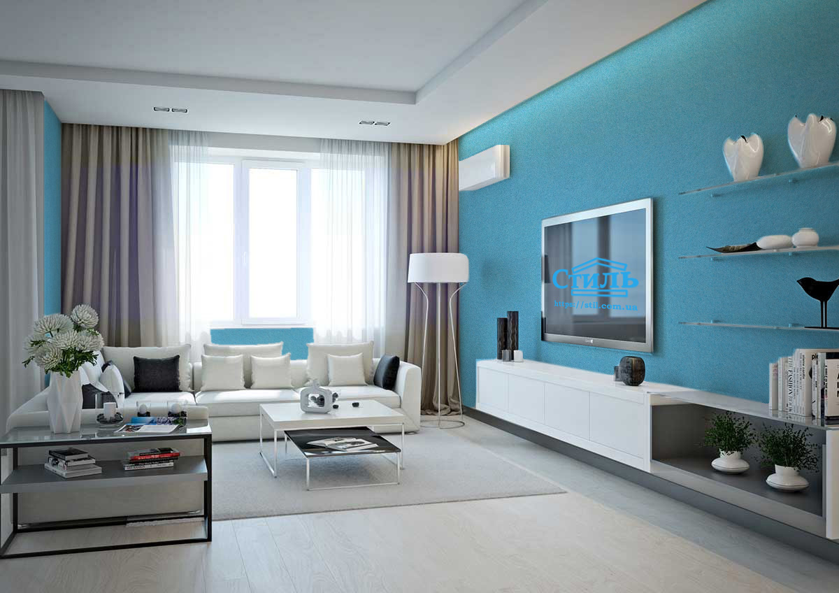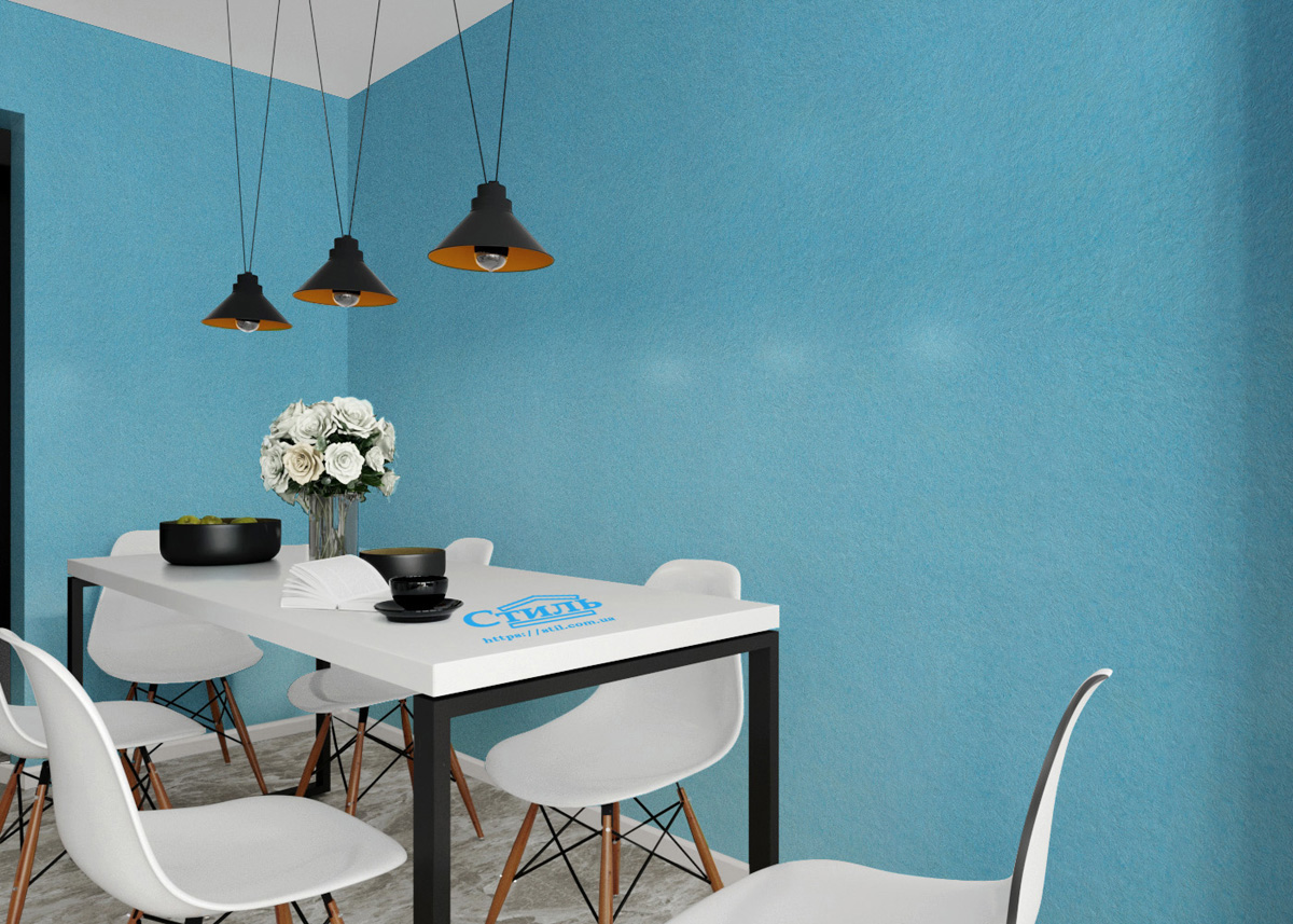 Используя жидкие обои тип 204 ТМ «Стиль» в интерьере, вы создадите ощущение покоя, расслабленности. Их небесно-голубой цвет подойдет для оформления любой комнаты при условии правильного его использования. Материал, нанесенный на акцентную стену, поможет расширить узкую гостиную. На кухне его можно эффектно дополнить лиловым, светло-зеленым, серым, бежевым и светло-розовым. Голубой в спальне в качестве доминантного отлично сочетается с желтыми, зелеными, розовыми деталями.