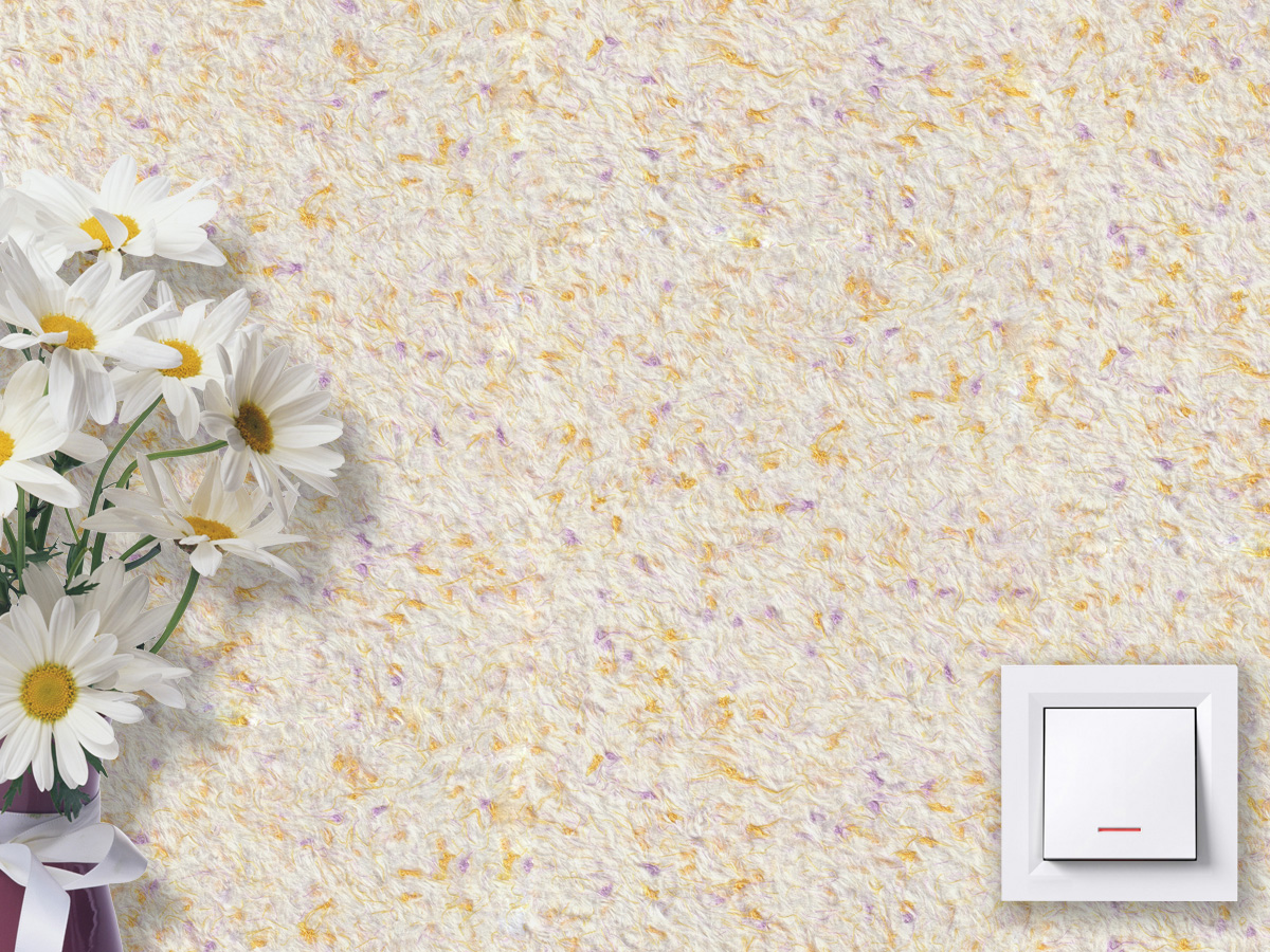 Тандем желтого и фиолетового цветов в интерьере довольно-таки необычен. Не все решаются его использовать и не всем он нравится. Но только если дело не касается жидких обоев тип 69 ТМ «Стиль». В их цветовом оформлении желтый и фиолетовый тона присутствуют в виде легких вкраплений, обеспечиваемых добавлением в состав материала цветных текстильных нитей.